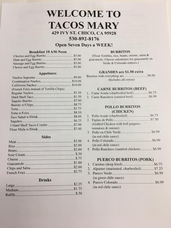 Introducing Tacos Mary, a Mexican restaurant located at 429 Ivy St Chico, CA 95928, known for its delicious and diverse menu. Customers rave about the friendly customer service and the flavorful dishes. With options like the cali burrito with asada, vegie especial burrito, and tacos de pastor, Tacos Mary offers a tantalizing experience for any food enthusiast. The menu caters to various dietary preferences with vegan and vegetarian choices available. The late-night opening hours make it a convenient spot for those craving authentic Mexican cuisine. Don't miss out on the mouthwatering flan for dessert. Tacos Mary stands out as a gem in Chico, offering a warm and welcoming atmosphere along with delectable dishes that keep customers coming back for more.